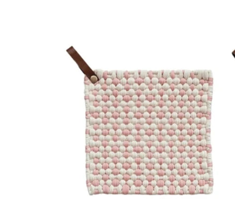 8" Square Cotton Crocheted Pot Holder w/ Leather Loop strap, 4 Styles- sold individually.
