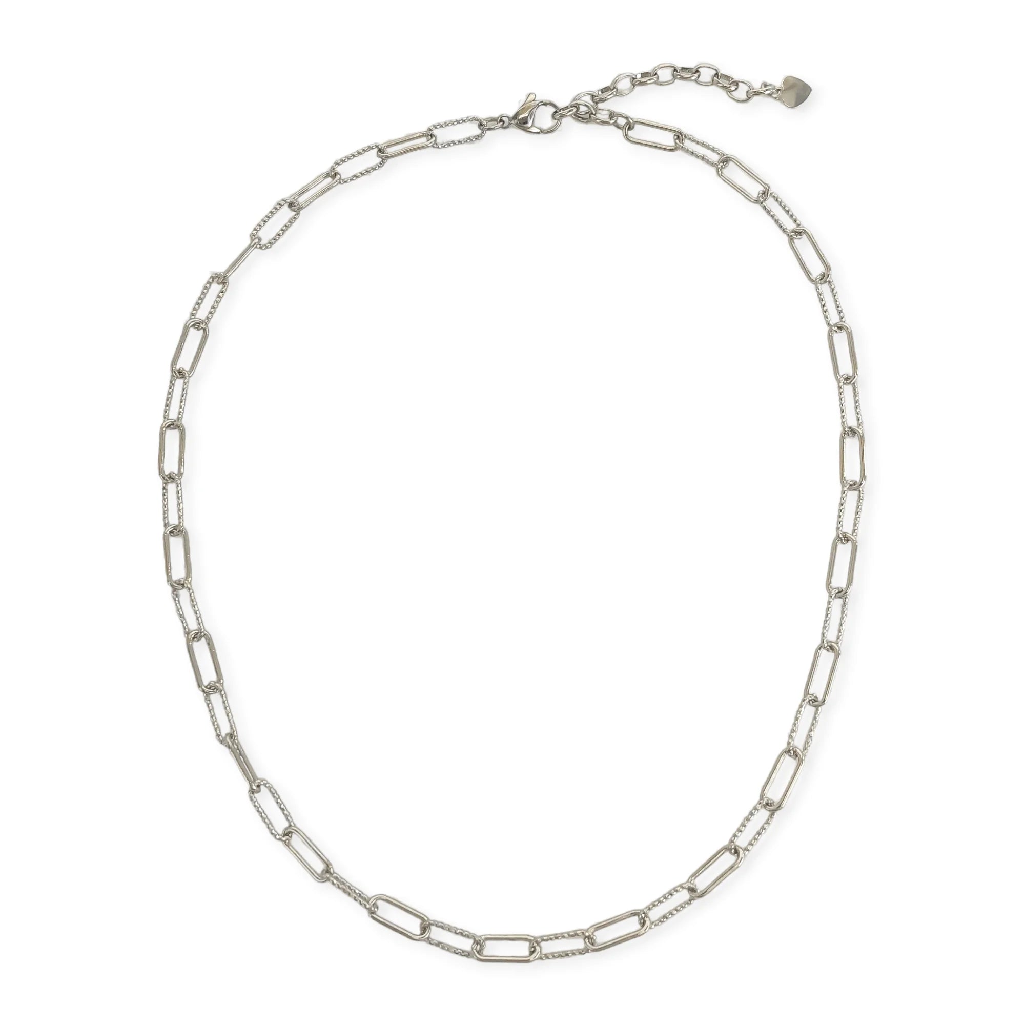 A delicate statement piece - a flat paperclip chain necklace with a lobster clasp closure, and each paperclip link is half textured. Rhodium only comes in 16".
