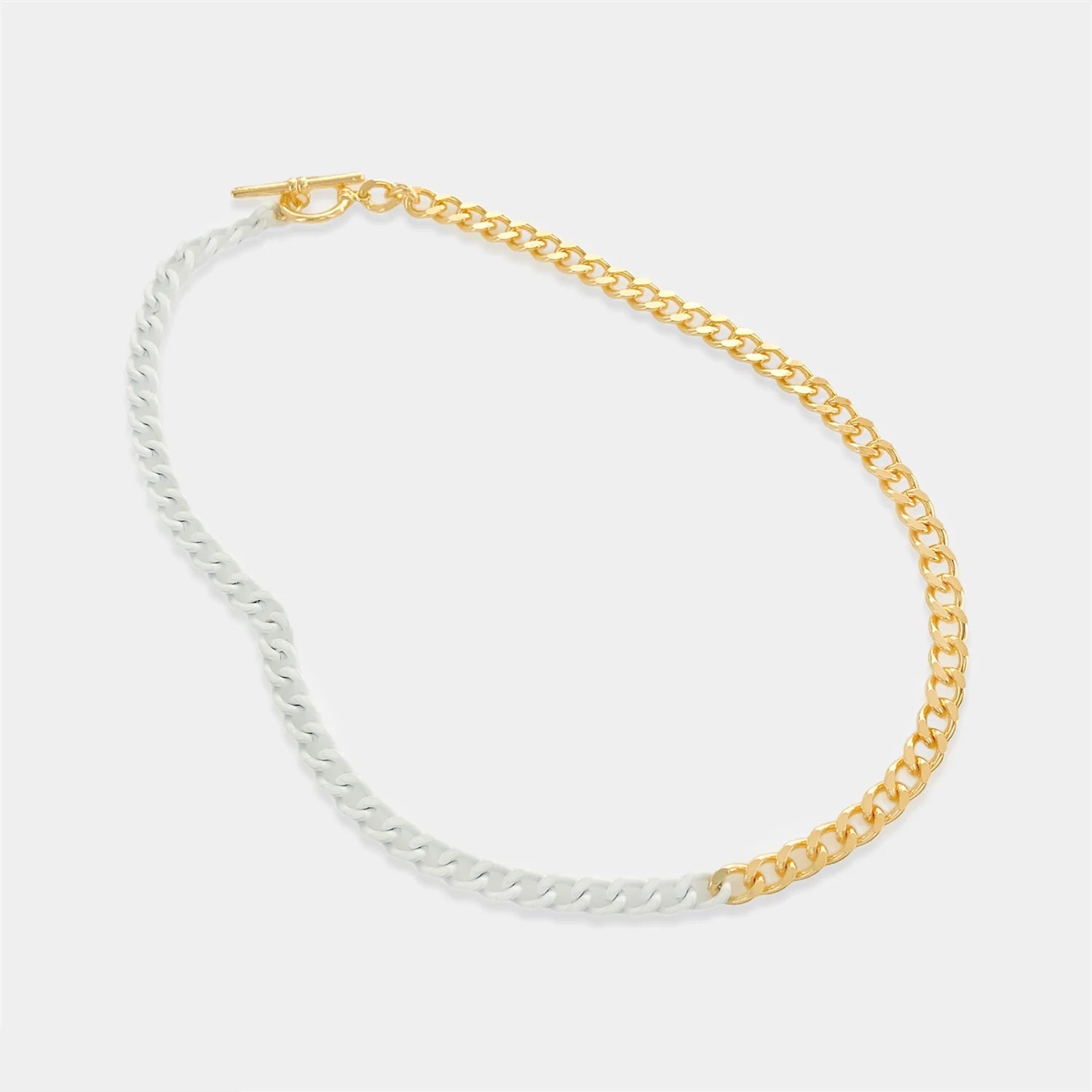 16" half gold, half enamel curb chain necklace with toggle. Enamel colors available in black, hot pink, light blue, lavender, mint, orange, pink, turquoise, white, and yellow.