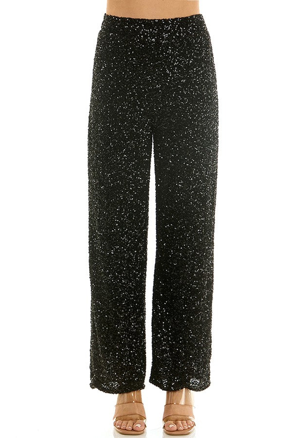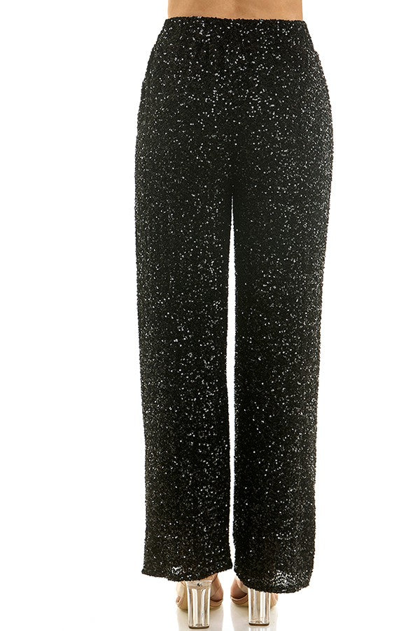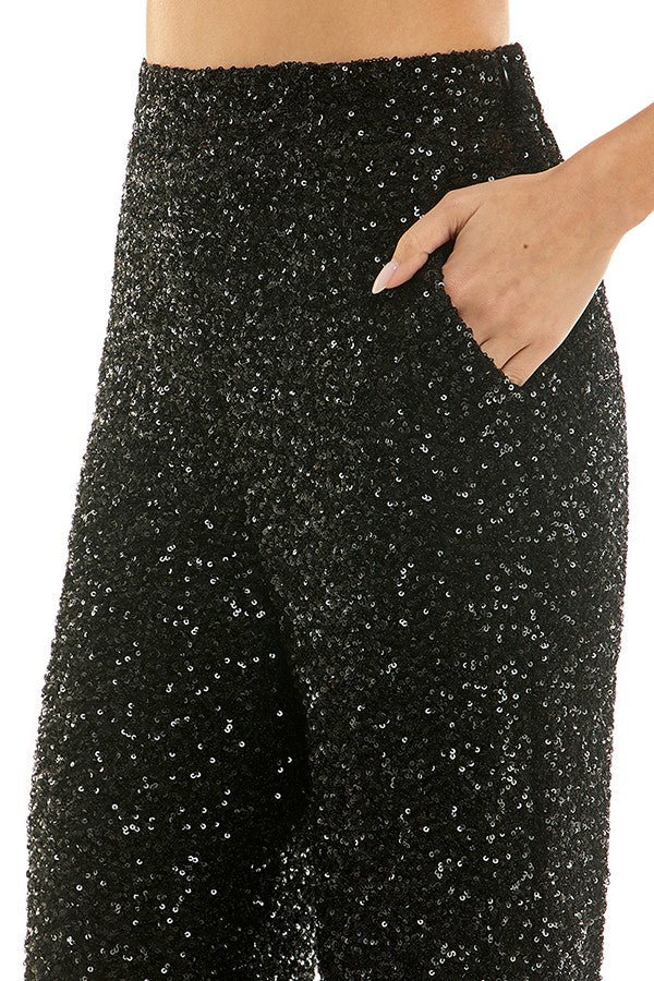 Black full sequin pants featuring side pockets and zipper with elastic back waistband.