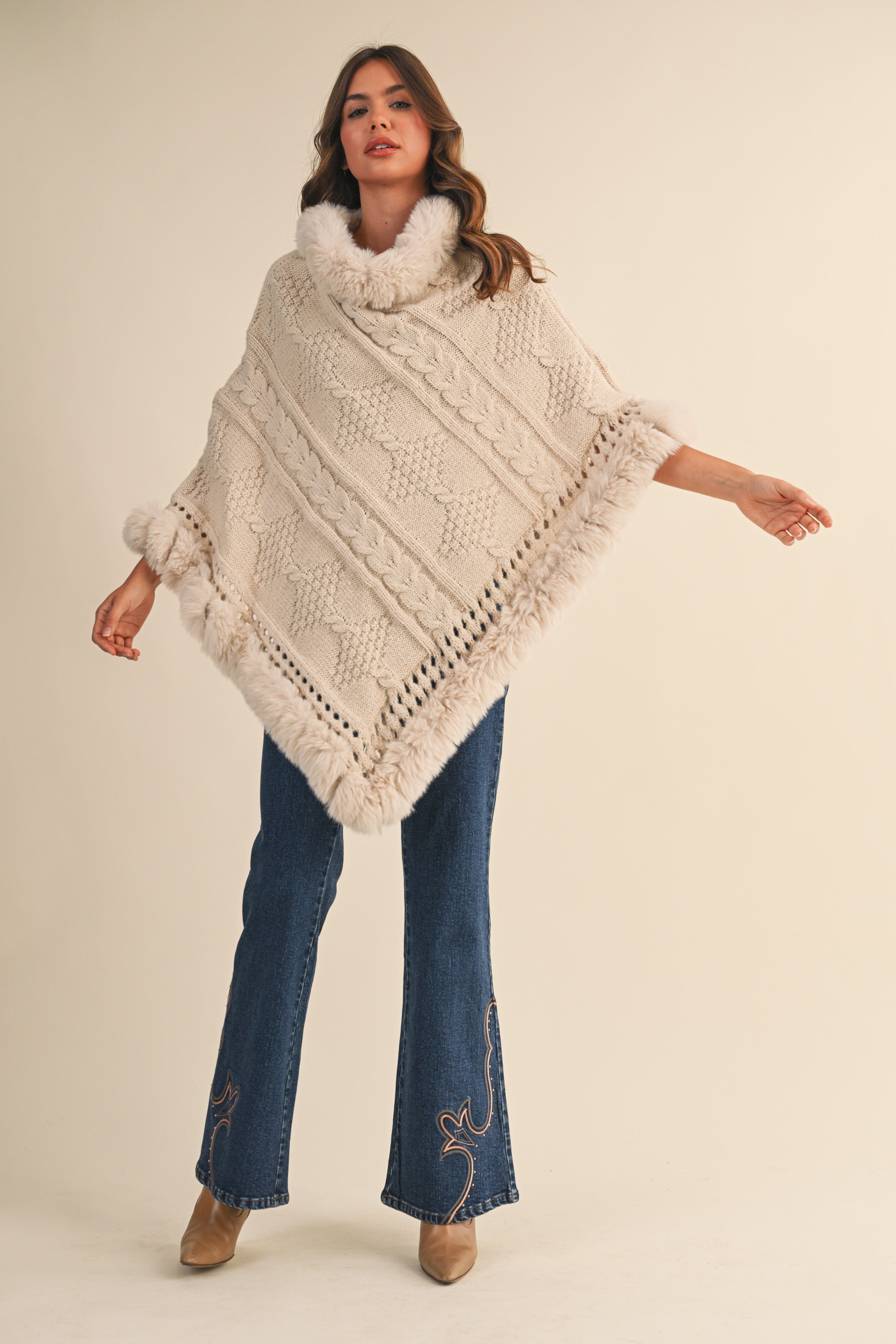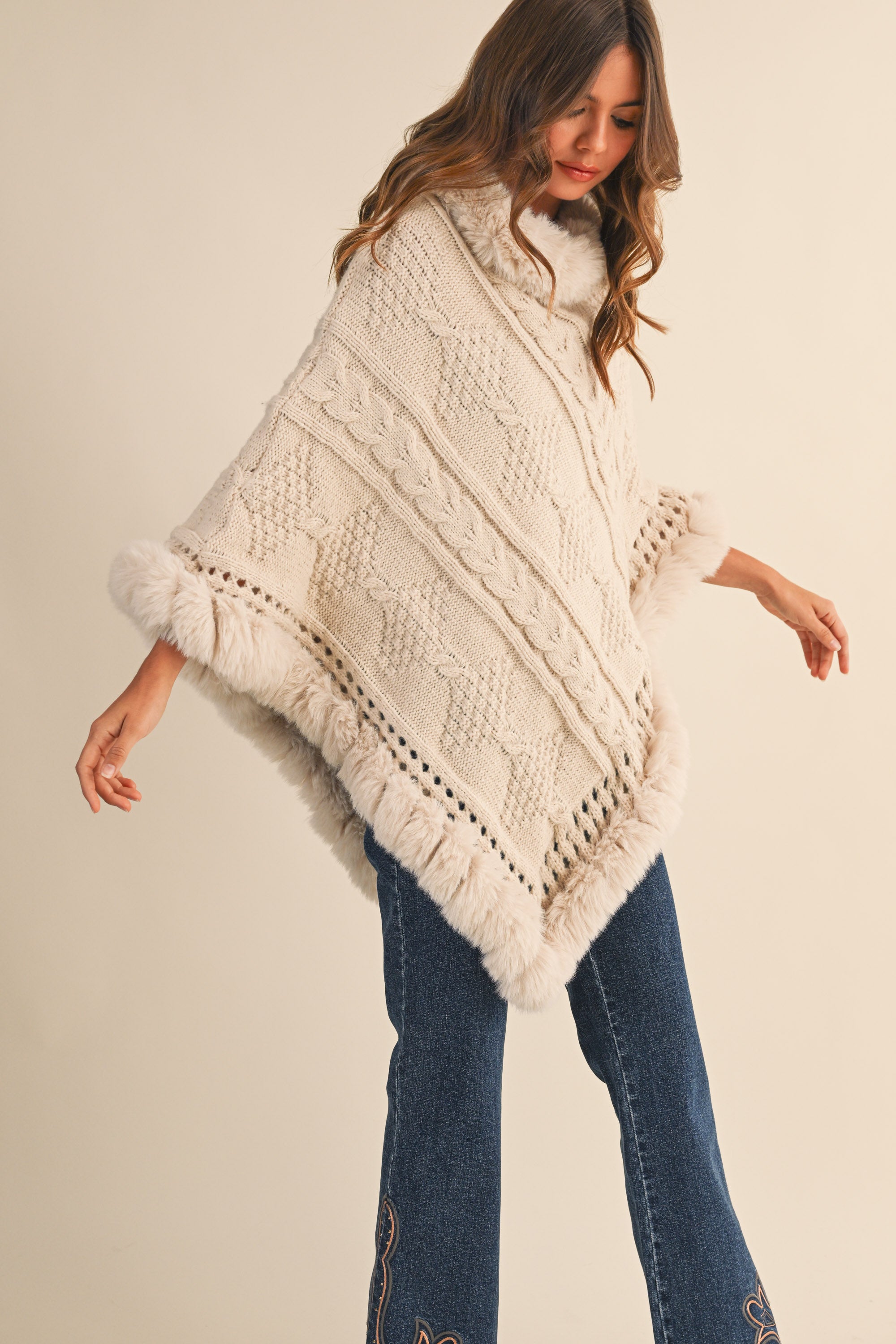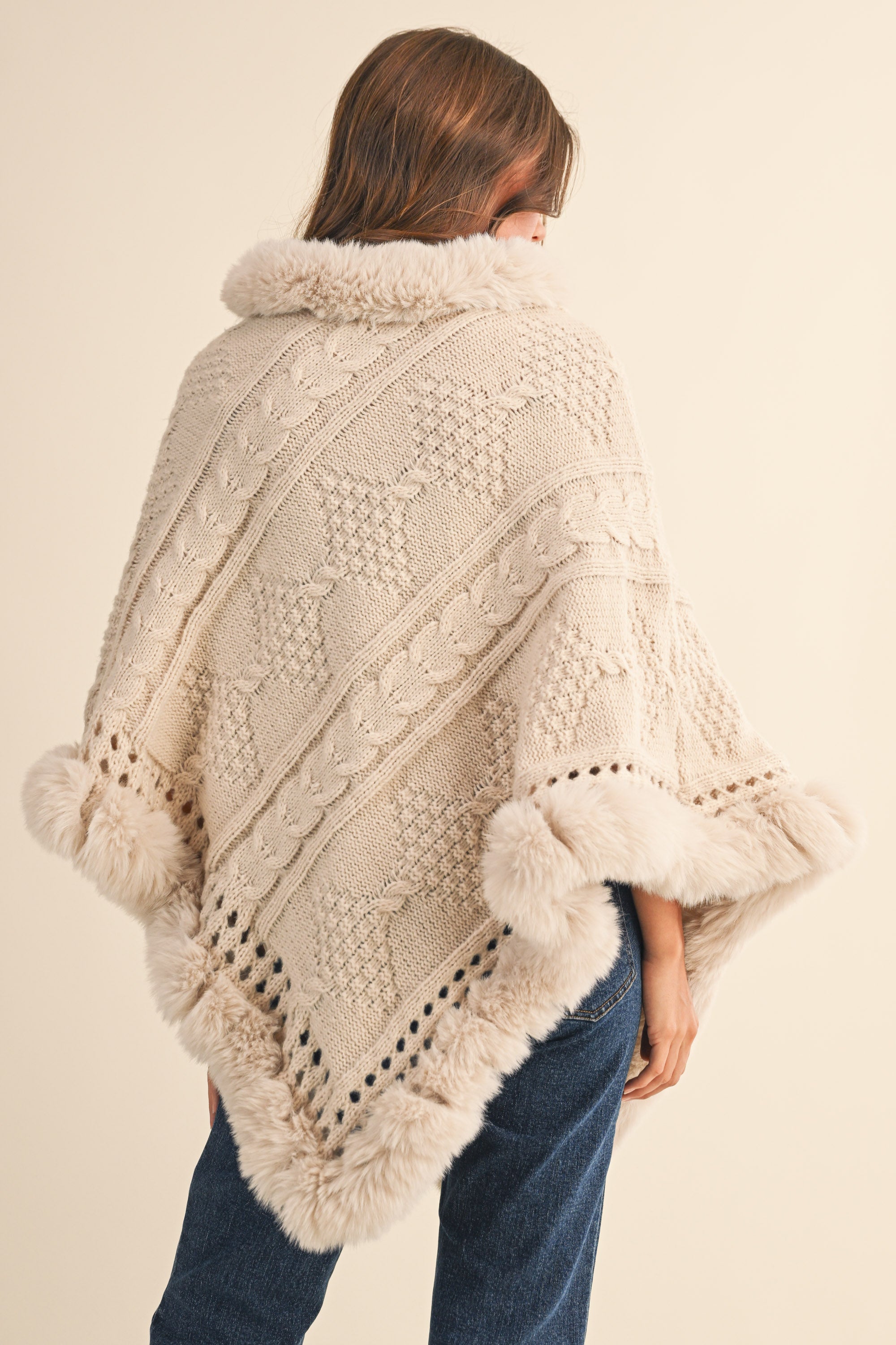 Cream knitted sweater cape poncho with fur trim. The perfect winter accessory!