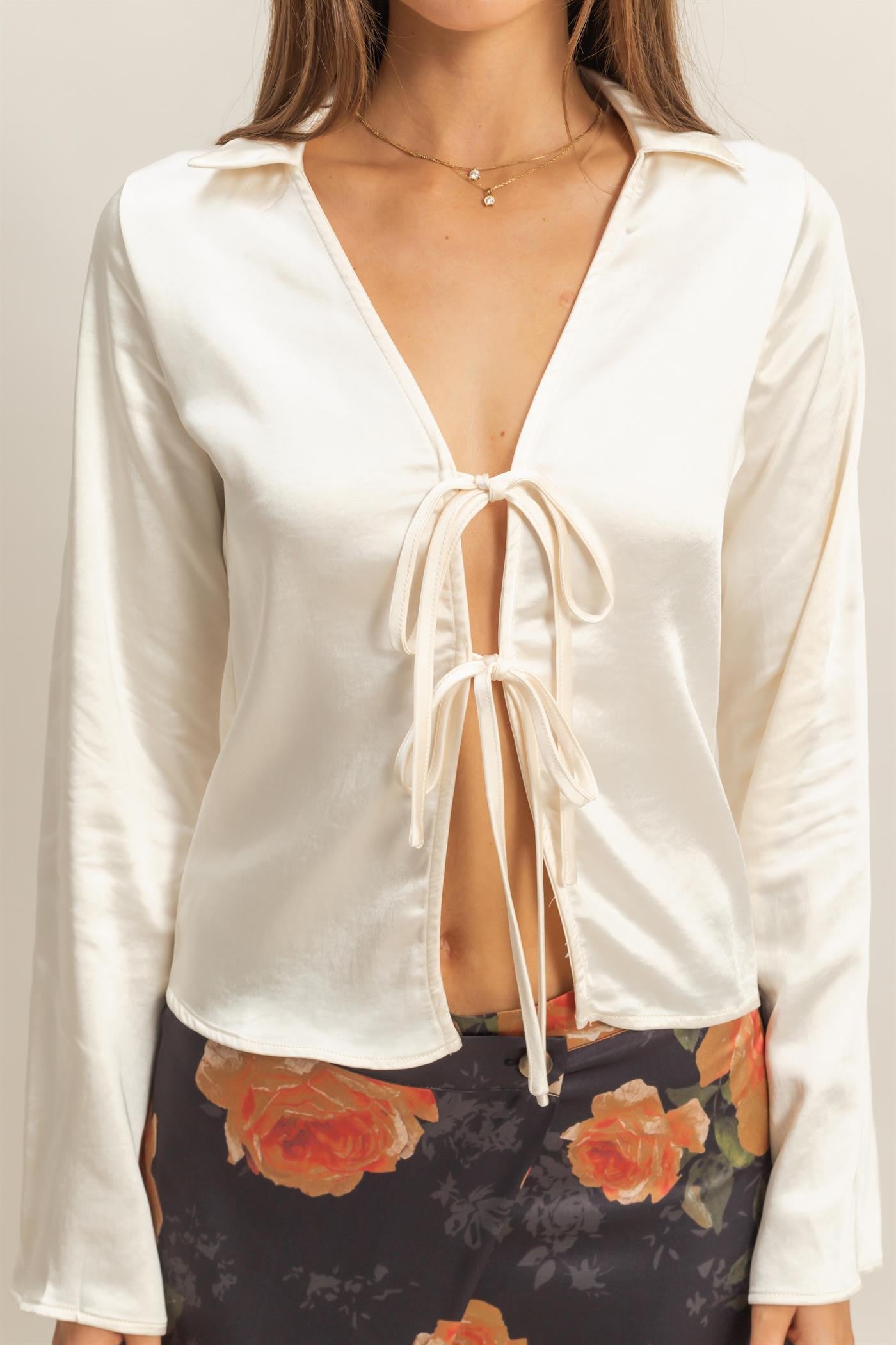 Cream satin tie front blouse with a laid back collar and flares sleeves.