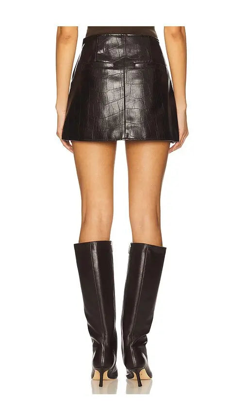 This chocolate brown mini skirt is made of faux leather fabric. It features a fully lined interior, hidden side zip closure, and front faux flap pockets. The skirt measures approximately 12.75" in length. From BLANKNYC in the color Inner Drive.