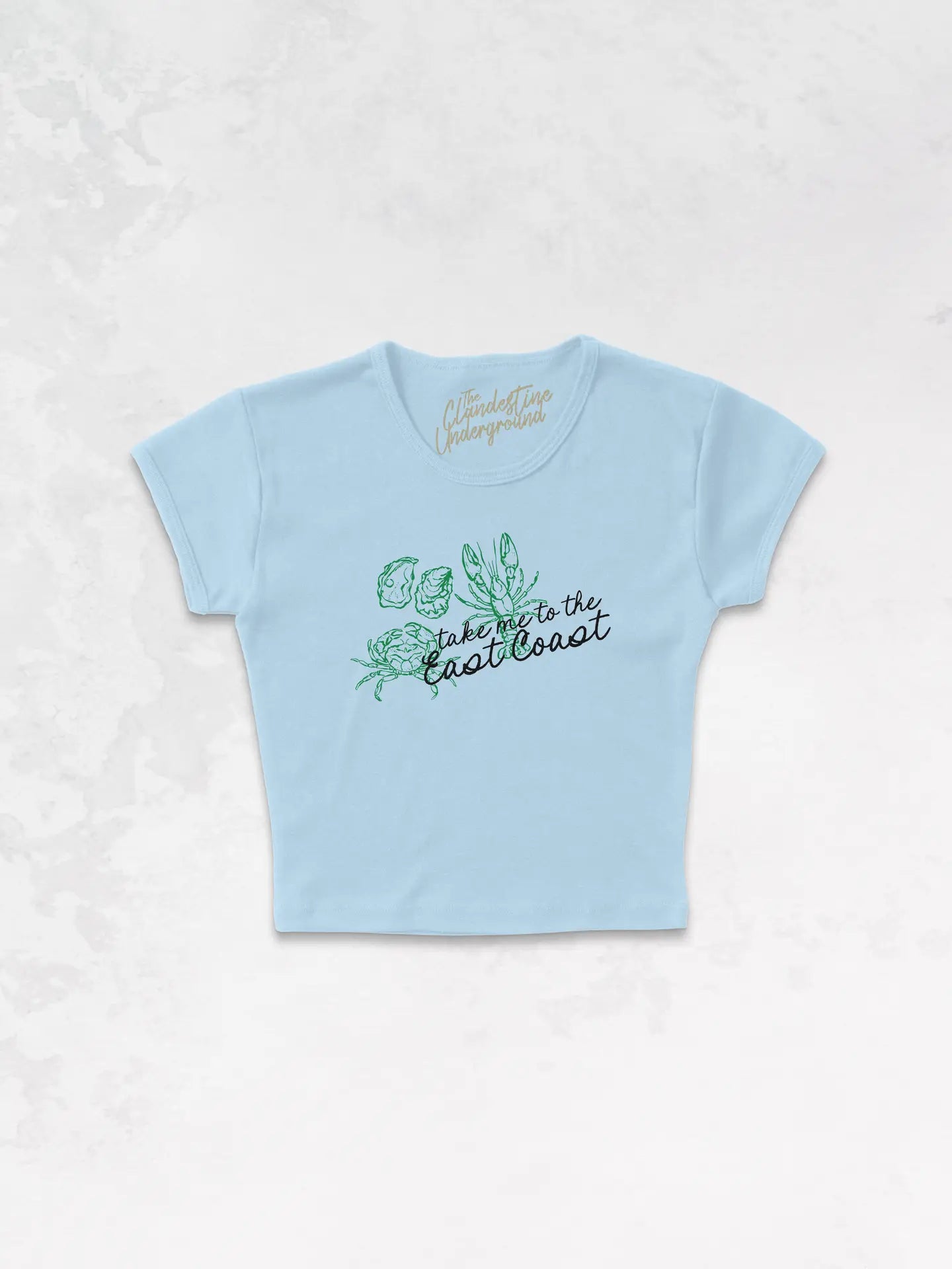 Blue baby tee with graphic saying "Take me to the East Coast" with lobster, crab and oyster shell graphic.