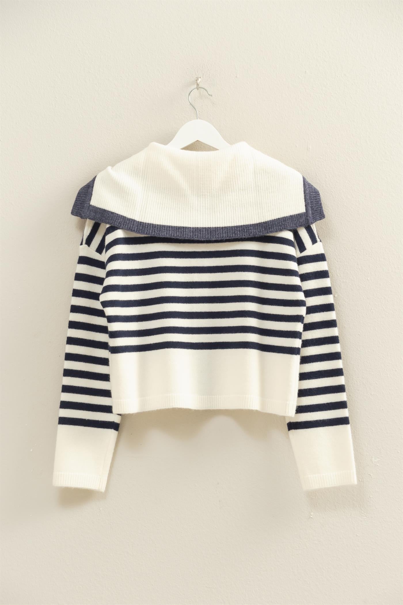 This casual sweater features a defined blue striped pattern, a classic button-up front and a sailor collar. The relaxed fit ensures comfort, making it perfect for layering over tees for a chic, laid-back look.