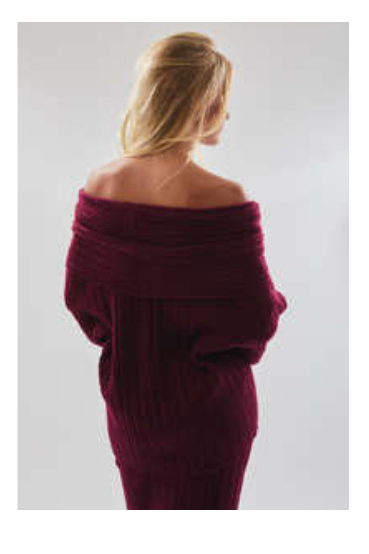 Burgundy ruby colored thick off the shoulder sweater with an oversized fit.