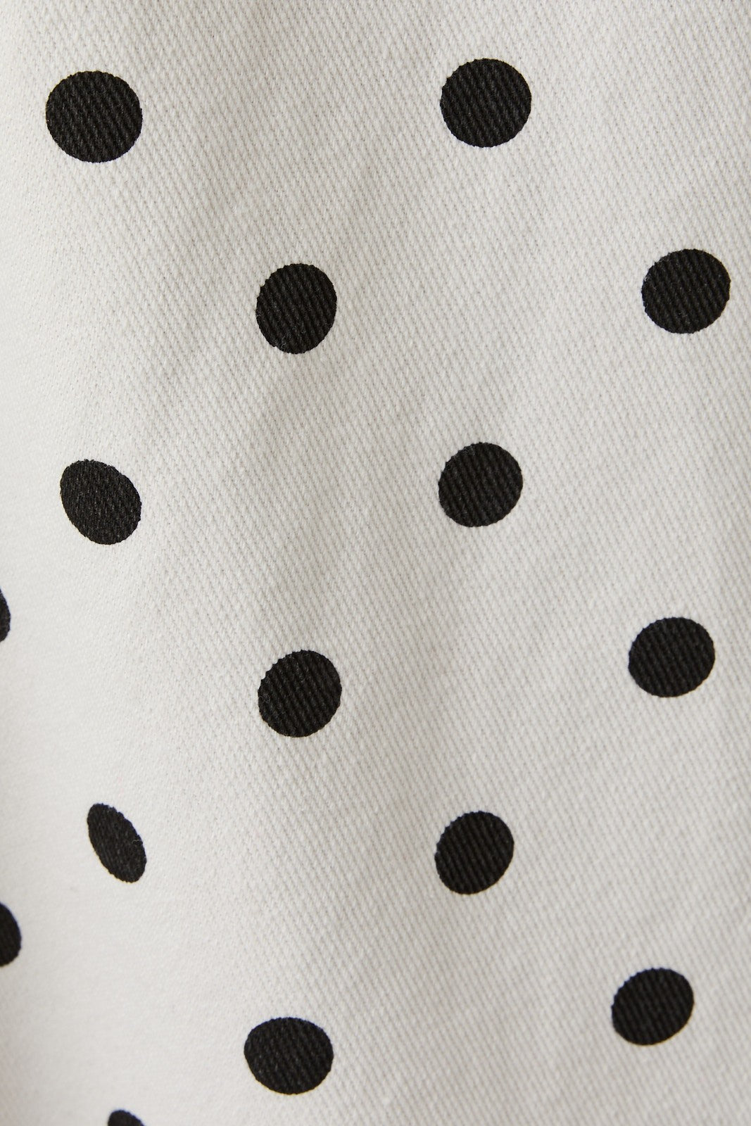 Black and white sleeveless polka dot denim dress with a scoop neckline.